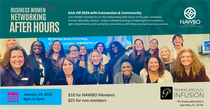 Join NAWBO Orlando for our first Networking After Hours of 2026, graciously hosted by Primera Specialty Infusion. This relaxed, in-person gathering offers the perfect opportunity to connect with fellow women business owners, build meaningful relationships, and kick off the year with purpose and community.