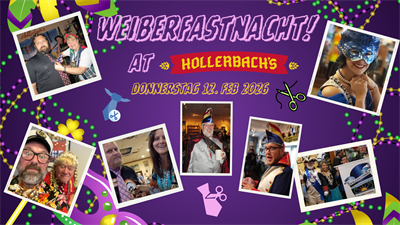 Frauen with scissors will be in charge Thursday night 2/12/26 at Hollerbach's, so Männer be on your best behavior - and don't wear a tie that you want to keep! Karneval costumes encouraged but not necessary. Nick and Eckhard will be performing their special Fasching show from 6-9 pm! Helau! Alaaf!