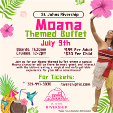 Set sail on a magical family adventure with our Moana Themed Character Cruise! Enjoy a scenic 2-hour cruise with a delicious all-you-can-eat buffet, character meet & greet, and breathtaking views along Lake Monroe and the St. Johns River.
