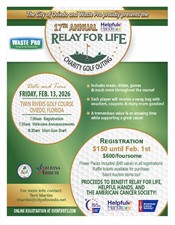 The City of Oviedo, in conjunction with Waste Pro presents the 17th Annual Relay for Life Charity Golf Outing! On Friday, Feb 13, 2026 this charity event will be hosted at the beautiful Twin Rivers Golf Course. Registration includes a snack style breakfast, a full hot lunch, drinks (soda, water, "other"), games, and 18 holes with a cart and a Power Pack. (Power pack examples are mulligans, sand trap throw, etc.) There will be exciting surprises throughout the course.